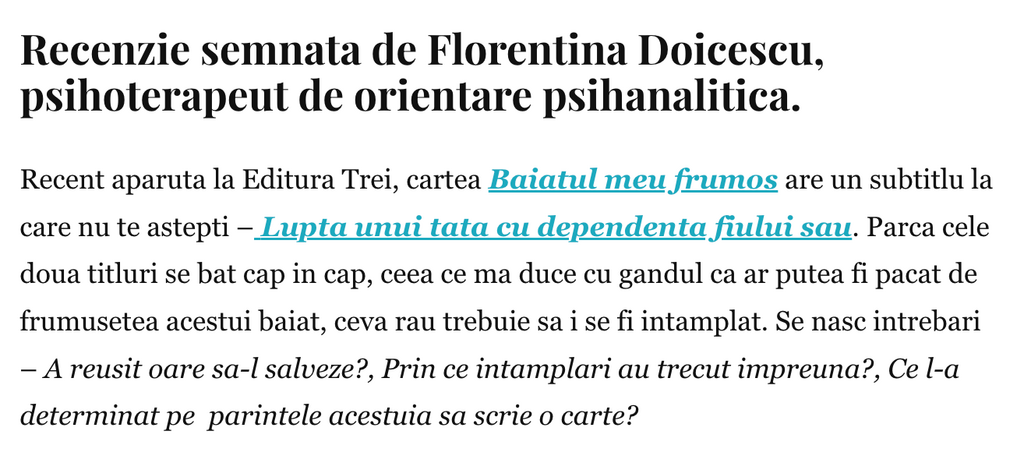 Recent aparuta la Editura Trei, cartea Baiatul meu frumos are un subtitlu la care nu te astepti – Lupta unui tata cu dependenta fiului sau. Parca cele doua titluri se bat cap in cap, ceea ce ma duce cu gandul ca ar putea fi pacat de frumusetea acestui baiat, ceva rau trebuie sa i se fi intamplat. Se nasc intrebari – A reusit oare sa-l salveze?, Prin ce intamplari au trecut impreuna?, Ce l-a determinat pe parintele acestuia sa scrie o carte?